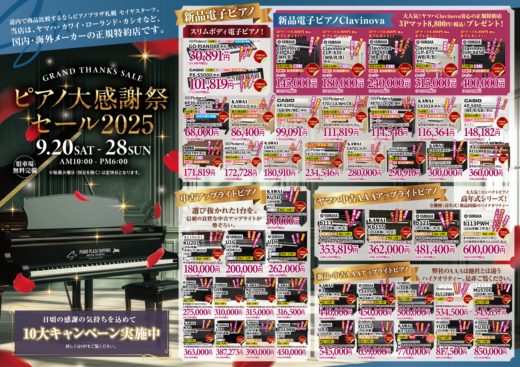 セールでお買い求めの新品・中古ピアノ!充実の弊社独自2年+5年無料の7年保証延長サービス!