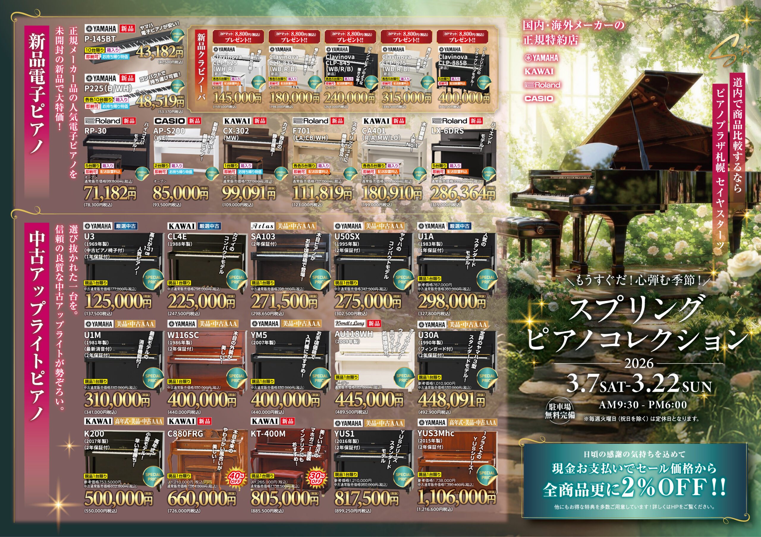 セールでお買い求めの新品・中古ピアノ!充実の弊社独自2年+5年無料の7年保証延長サービス!