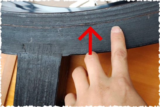 響板割れです。お部屋が乾燥している環境でおこる現象です。この場合は、ピアノの音に大きな影響がでてきます。引き取り時に残念ながら減額されますのでご了承ください。